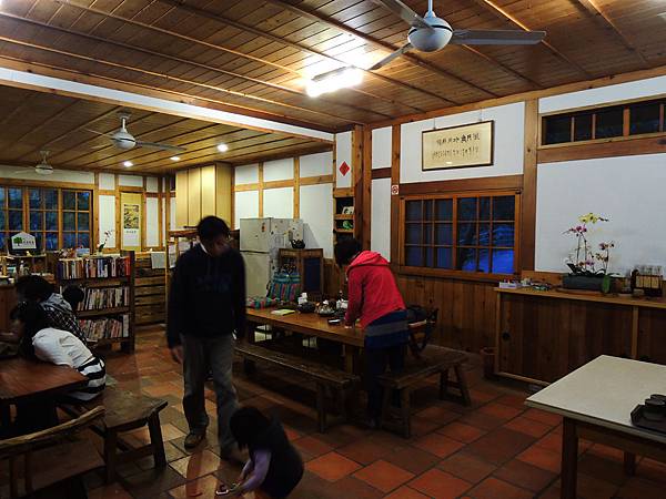 大廳裡擺放簡單的桌椅,房客們晚上可以在這兒泡茶聊天或看看書,也有一些桌上遊戲可以玩喔(夜間導覽完後,民宿夥伴也會在這邊跟大家泡茶聊天,