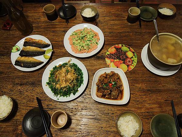 印象中大約是五菜或六菜一湯吧,然後白飯無限量供應,要到後面的灶上取用(不過應該是先把飯蒸好再放上去拉XD)