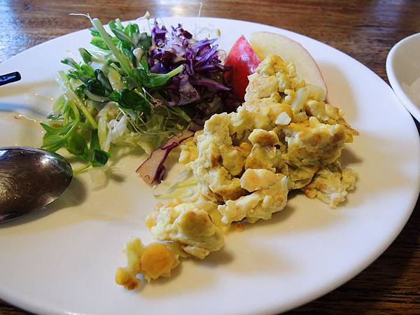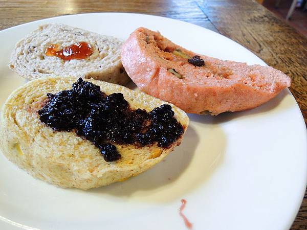 採自助式取用,有沙拉、饅頭、水果、紫米粥、米漿等等,可以搭配他們自製的梅子醬、桑葚果醬等